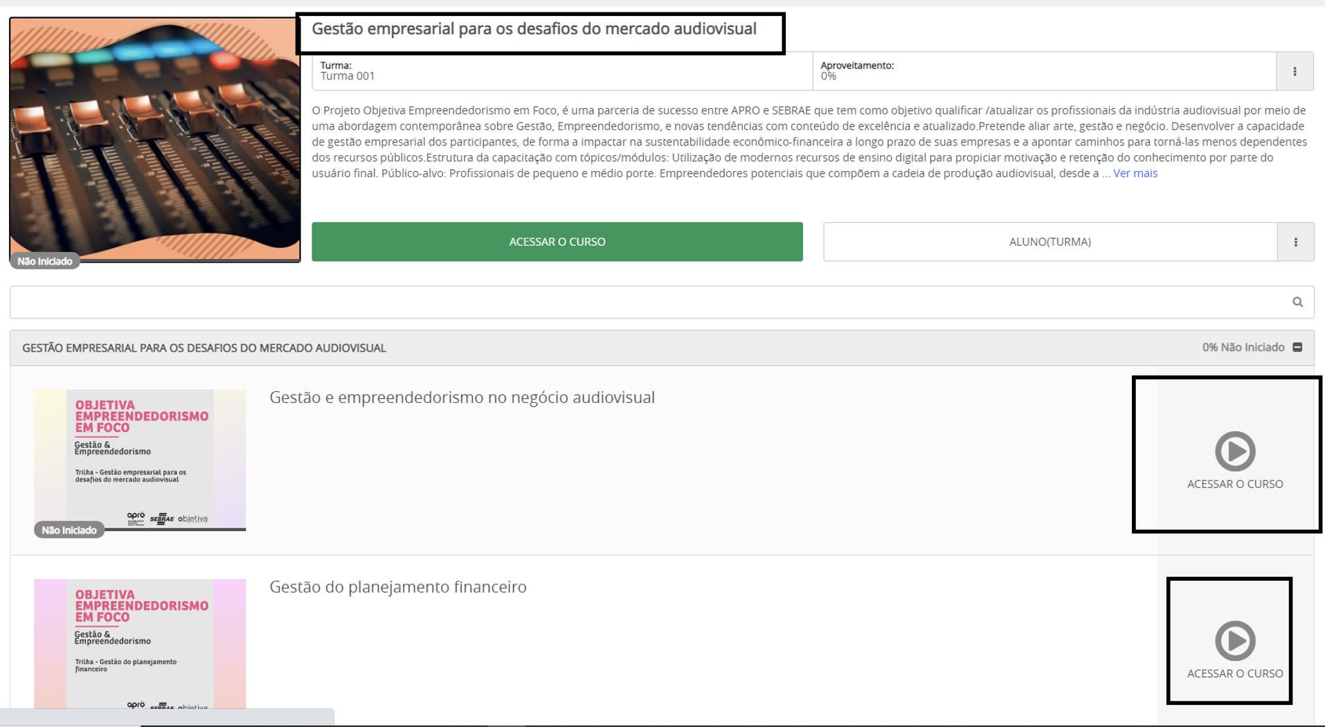 - Depois desses passos, o aluno será redirecionado para o ambiente do curso, e verá a trilha/tema em que se matriculou.